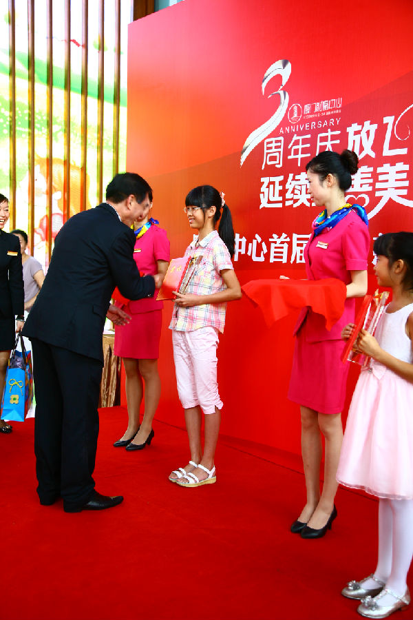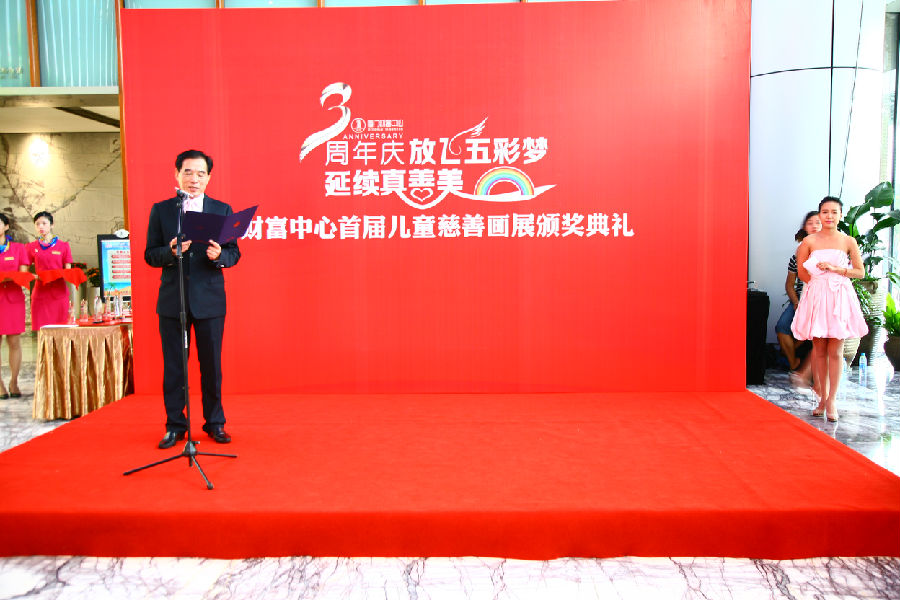 上午十點,在開禾小學(xué)精彩的民族舞表演中,“放飛五彩夢,延續(xù)真善美”財富三周年暨兒童慈善畫展頒獎典禮正式拉開序幕。恒興集團資產(chǎn)管理部總經(jīng)理虞伯南代表恒興集團及廈門財富中心上臺致辭,他表示:此次舉辦兒童慈善畫展,一方面是為了加強財富中心租戶之間的互動,給租戶子女提供一個才藝展示的平臺,也借此喚起大家無憂無慮的童年記憶;另一方面,希望通過這些天真無邪的孩子們的畫筆,描繪出一個燦爛的明天,構(gòu)筑起一座愛心的橋梁。通過慈善義賣的方式將孩子們的愛心和美好愿望傳遞,幫助那些求學(xué)路上的貧困兒童。