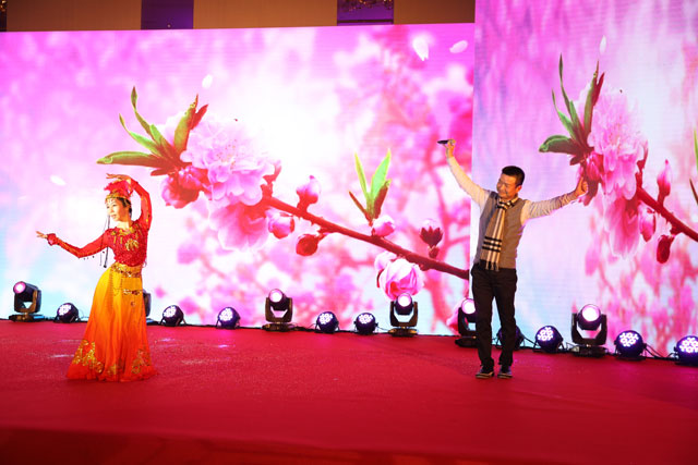 ? ? ? ? 晚會分為兩大流程——頒獎典禮和迎春晚會。上半場現(xiàn)場表彰了恒興集團(tuán)“十佳員工”、“優(yōu)秀管理者”、“優(yōu)秀團(tuán)隊”及“新疆金川公司技術(shù)進(jìn)步成果”,各位高管輪番上臺為獲獎個人及團(tuán)隊頒獎,滿載著贊賞與祝福。這隆重的頒獎典禮,不僅是對獲獎?wù)呷ミ^一年工作的肯定與嘉獎,也是對所有員工的激勵與鼓舞??露H自上臺致辭對獲獎?wù)弑硎咀YR和感謝,并舉起酒杯,在現(xiàn)場的歡呼聲與掌聲中,正式宣布晚宴開席。