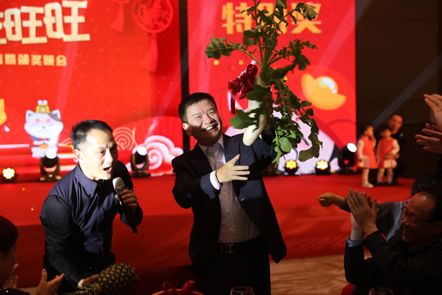 ? ? ? ? 本場晚會大的亮點(diǎn)是“特殊獎”頒獎環(huán)節(jié),由恒興集團(tuán)孔宇峰董事、副總裁親自主持,感謝柯董這一年來辛勤工作、睿智決策,帶領(lǐng)恒興集團(tuán)一步一步走向輝煌??卓傇诂F(xiàn)場為柯董送上“菜頭”和“菠蘿”,寓意恒興集團(tuán)及柯董一家新年好彩頭和好運(yùn)旺旺來。隨后,柯董抽取幸運(yùn)大抽獎的獎項(xiàng)——5800現(xiàn)金大獎花落投資部的莊巧玲的手中??绿殖伺d抽出總額達(dá)十萬港幣的獎項(xiàng),將晚會推上了一波新高潮。本晚會的中獎率達(dá)80%,幾乎人人有獎,各個喜笑顏開。