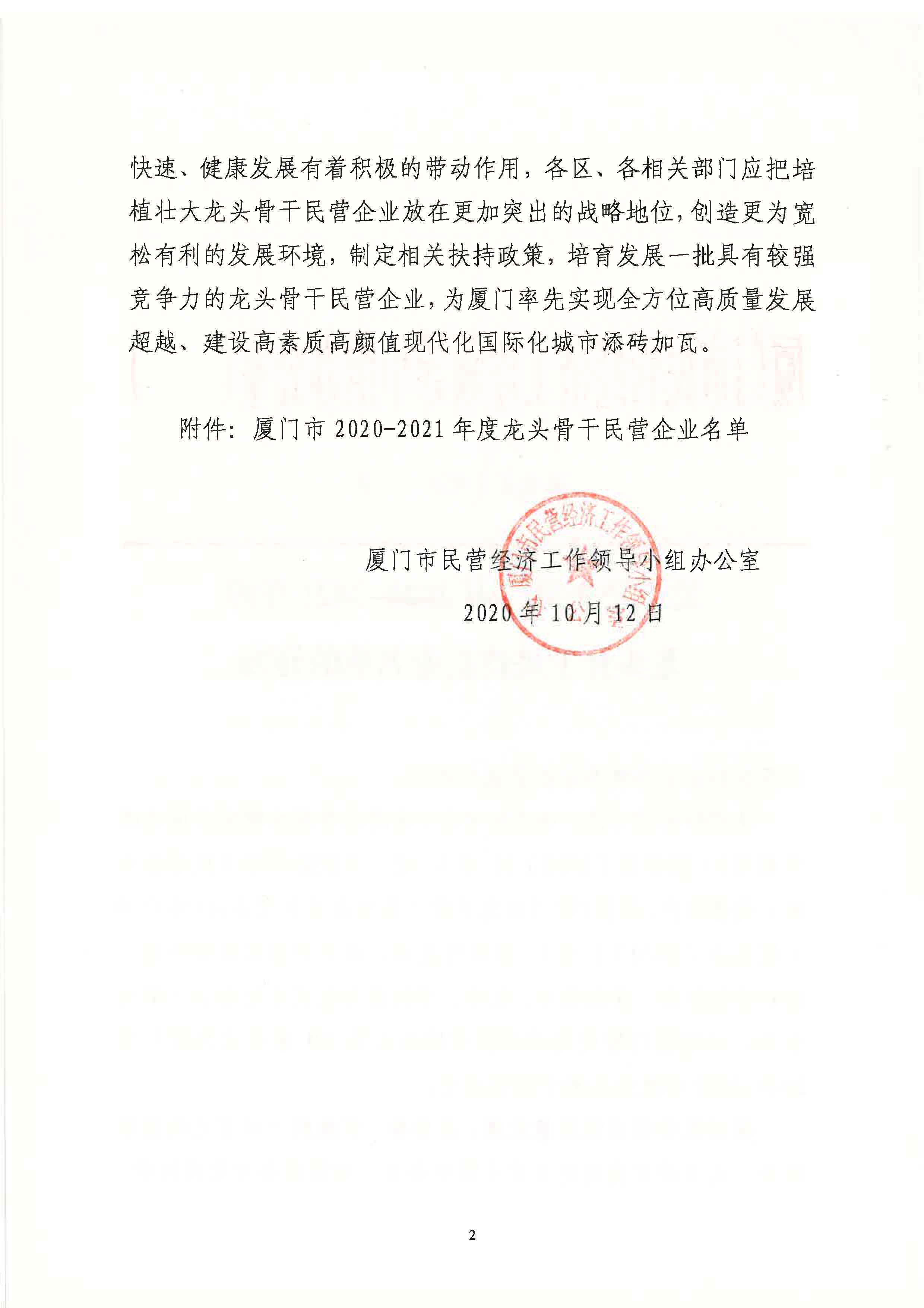 日前,廈門市民營經(jīng)濟工作領(lǐng)導小組辦公室下發(fā)《關(guān)于公布廈門市年度龍頭骨干民營企業(yè)名單的通知》,廈門恒興集團作為其他現(xiàn)代服務業(yè)企業(yè),獲得“廈門市年度龍頭骨干民營企業(yè)”稱號。