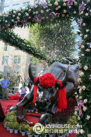 正式儀式開始前,全場來賓共同進(jìn)行了一場隆重而莊嚴(yán)的升旗儀式。五星紅旗、恒興集團(tuán)和財富中心的旗幟冉冉升起,預(yù)示著“廈門財富中心”這一嶄新而富有生機(jī) 的海西明珠已在鷺江道百年商圈灼灼閃耀。緊接著,廈門市領(lǐng)導(dǎo)徐模、陳昭揚、葉重耕、翁云雷與恒興集團(tuán)柯希平董事長為財富中心吉祥物“財富金?!苯也剩谝?陣連續(xù)歡騰的開鑼聲中揭開了金牛的神秘面紗,也正式拉開了落成慶典的序幕。