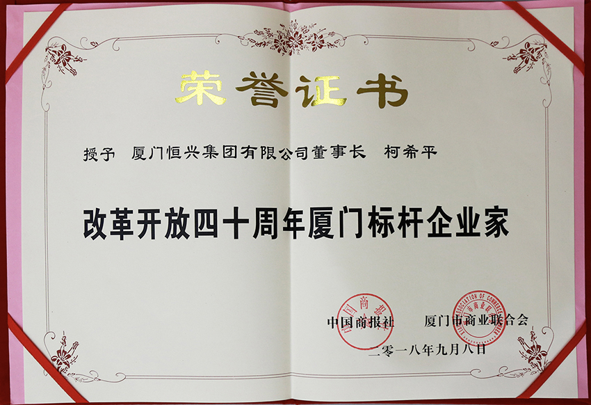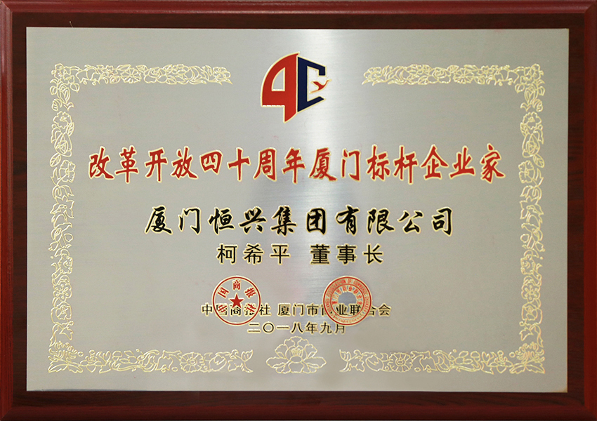 金秋迎盛會(huì),改革促發(fā)展。9月8日,在第二十屆中國(guó)國(guó)際投資貿(mào)易洽談會(huì)開幕之際,中國(guó)商報(bào)社、廈門市商業(yè)聯(lián)合會(huì)攜手主辦的“改革開放四十周年廈門標(biāo)桿企業(yè)家、創(chuàng)業(yè)精英、助力品牌、創(chuàng)新品牌”推選活動(dòng)在廈門舉行頒獎(jiǎng)儀式,61家企業(yè)家和品牌獲得殊榮。廈門恒興集團(tuán)柯希平董事長(zhǎng)榮獲“改革開放四十周年廈門標(biāo)桿企業(yè)家”榮譽(yù)稱號(hào)。