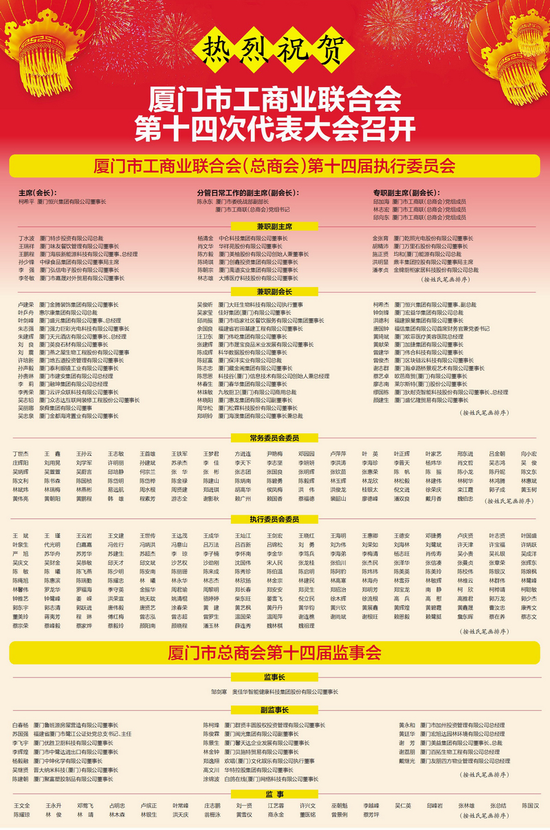 會議選舉產(chǎn)生廈門市工商業(yè)聯(lián)合會(總商會)第十四屆執(zhí)行委員會、廈門市總商會第十四屆監(jiān)事會組成人員,恒興集團董事長柯希平連任主席(會長),奧佳華集團董事長鄒劍寒當選監(jiān)事長。